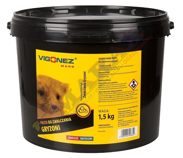 VIGONEZ MARS PASTA DO ZWALCZANIA GRYZONI zawiera substancję czynną: 3-[3-(bifenyl-4-ylo)-1,2,3,4-tetrahydro-1-naftylo]-4-hydroksykumaryna/Difenakum 0,05 g/kg CAS: 56073-07-5 związek grupy antykoagulantów wyjątkowo skuteczny nawet w przypadku dużych gryzoni na nie odpornych. Ponadto zawiera benzoesan denatonium 0,01g/kg CAS; 3734-33-6, środek zniechęcający do spożycia przez ludzi. VIGONEZ MARS PASTA DO ZWALCZANIA GRYZONI skutecznie zwalcza myszy, szczury, łasice oraz kuny w pomieszczeniach zamkniętych oraz na zewnątrz budynku. Skład pasty jest specjalnie dostosowany do potrzeb i preferencji żywieniowych gryzoni, dzięki temu jest niezwykle atrakcyjna w stosunku do naturalnego pożywienia. Unikalna formuła pasty pozwala na monitorowanie pobrań preparatu przez gryzonie. Pozostawione ślady na paście po jej pobraniu informują z jakim gryzoniem mamy do czynienia. Pasta zwiera środki mumifikujące.
