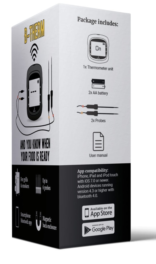 Nasz cyfrowy termometr B-Therm do mięsa pozwala monitorować temperaturę przez telefon lub tablet z odległości 60m.